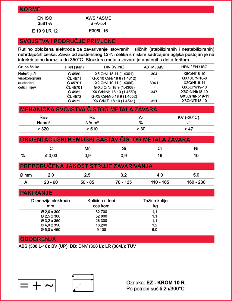 Rutilno obložena elektroda za zavarivanje istovrsnih i sličnih (stabiliziranih i nestabiliziranih) nerđajućih čelika. Zavar od austenitnog Cr-Ni čelika s niskim sadržajem ugljika postojan je na interkristalnu koroziju do 350°C. Struktura metala zavara je austenit s delta feritom.