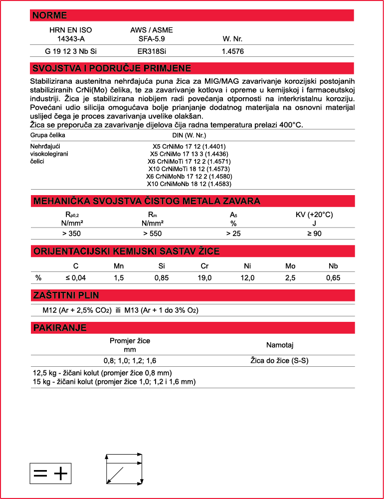 Stabilizovana, austenitna, nerđajuća puna žica za MIG/MAG zavarivanje korozijski postojanih, stabilizovanih CrNi(Mo) čelika, te za zavarivanje kotlova i opreme u hemijskoj i farmaceutskoj industriji. Žica je stabilizovana niobijem radi povećanja otpornosti na interkristalnu koroziju. Povećani udeo silicijuma omogućava bolje prijanjanje dodatnog materijala na osnovni materijal usled čega je proces zavarivanja uveliko olakšan.