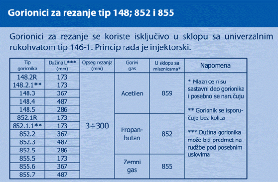 Gorionici za rezanje tip 148; 852 i 855 se koriste isključivo u sklopu sa univerzalnim rukohvatom tip 146-1. Princip rada je injektorski.