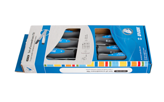 - 5 kom. pljosnatih odvijača sa TBI ručkom (art. 605TBI), dim. 0.5×3.0x80, 0.8×4.0x100, 1.0×5.5×125, 1.2×6.5×150, 1.2×8.0x175
